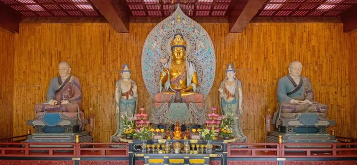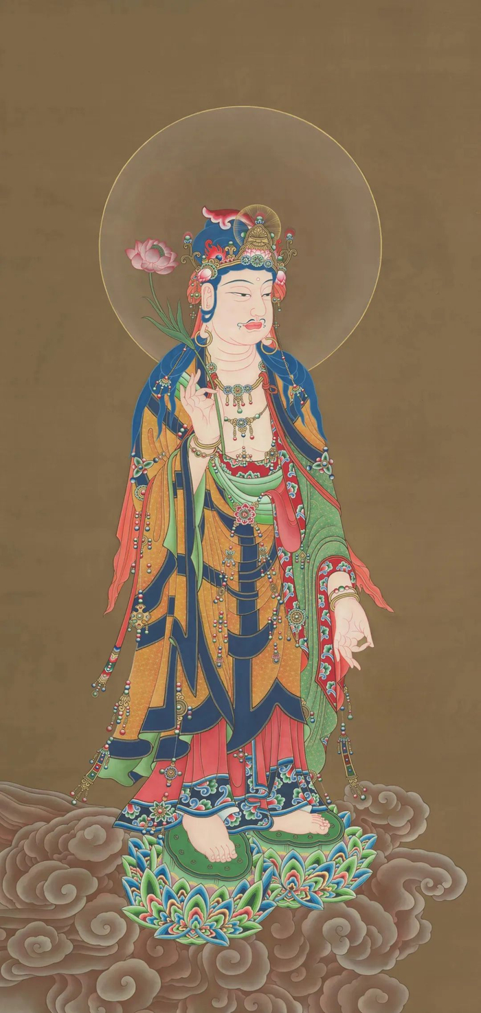 大势至菩萨,是阿弥陀佛的右胁侍者,与阿弥陀佛、观世音菩萨(阿弥陀佛的左胁侍)合称为“西方三圣”。据《悲华经》记载,阿弥陀佛入灭后,将由观世音菩萨补其位。观世音菩萨入灭后,则由大势至菩萨补处成佛。大势至菩萨被认为是光明智慧第一,所到之处天地震动保护众生,免受邪魔所害。