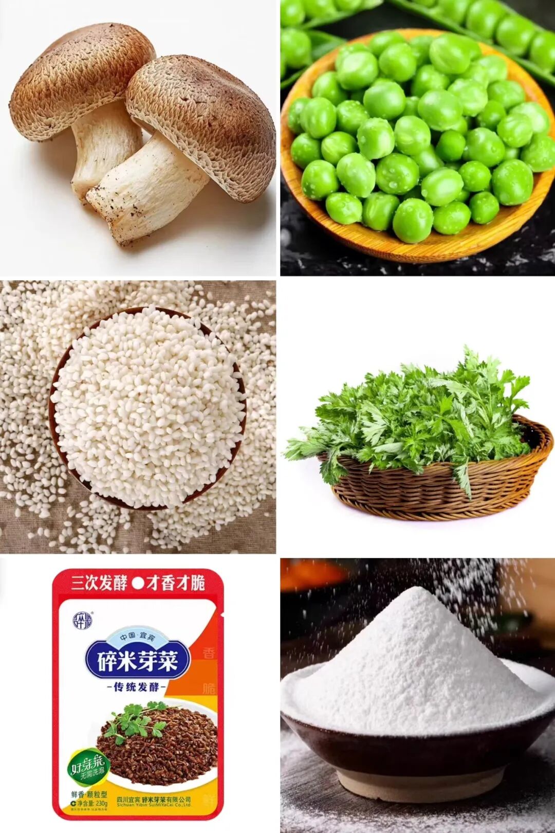 糯米粉60克、大米粉70克、艾蒿叶30克、糯米125克、鲜香菇150克、鲜杏鲍菇30克、鲜豌豆35克、宜宾碎米芽菜(或盐儿菜)43克、玉米油60克、美极鲜味汁11克、花椒粉0.3克、太太乐蔬之鲜1.5克。